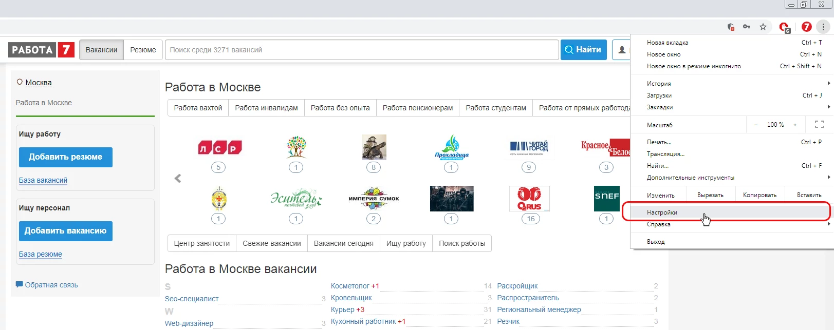 2. Выберите пункт "Настройки";