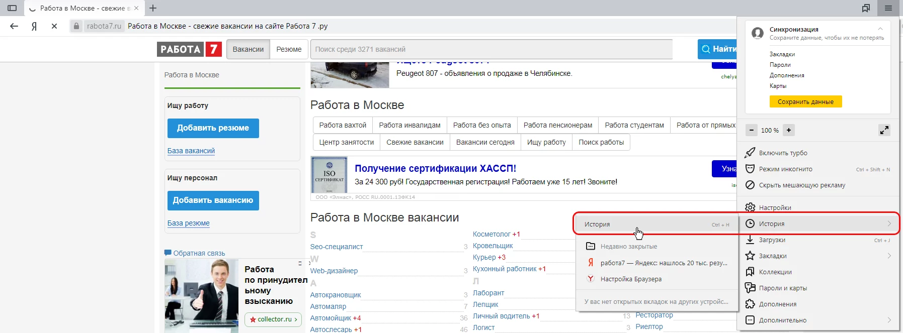 2. Выберите пункт "История";