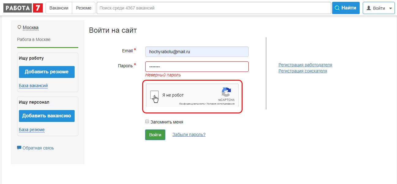 Если при входе в работодательский кабинет на Rabota7.ru появилось окошко с надписью «Я не робот», значит, система заподозрила вероятность взлома вашего аккаунта. Чтобы удостовериться, что это именно вы, а не компьютерные программы, внедренные спамерами или мошенниками, система предлагает задачу, которая крайне трудоемка для компьютера.